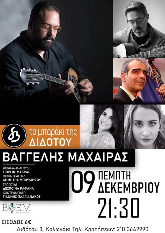 Ο γνωστός μουσικός και συνθέτης Βαγγέλης Μαχαίρας, μετά την κυκλοφορία της νέας του δισκογραφικής δουλειάς σε στίχους του Δημήτρη Λέντζου με τίτλο «Τα χέρια» (εκδόσεις Μετρονομος), επιστρέφει στο Μπαράκι της Διδότου παρουσιάζοντας καινούργια αλλά και παλιότερα τραγούδια του.
